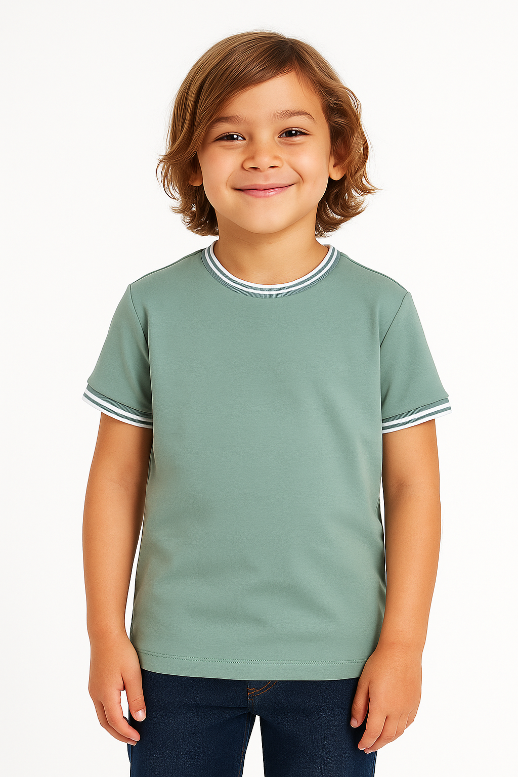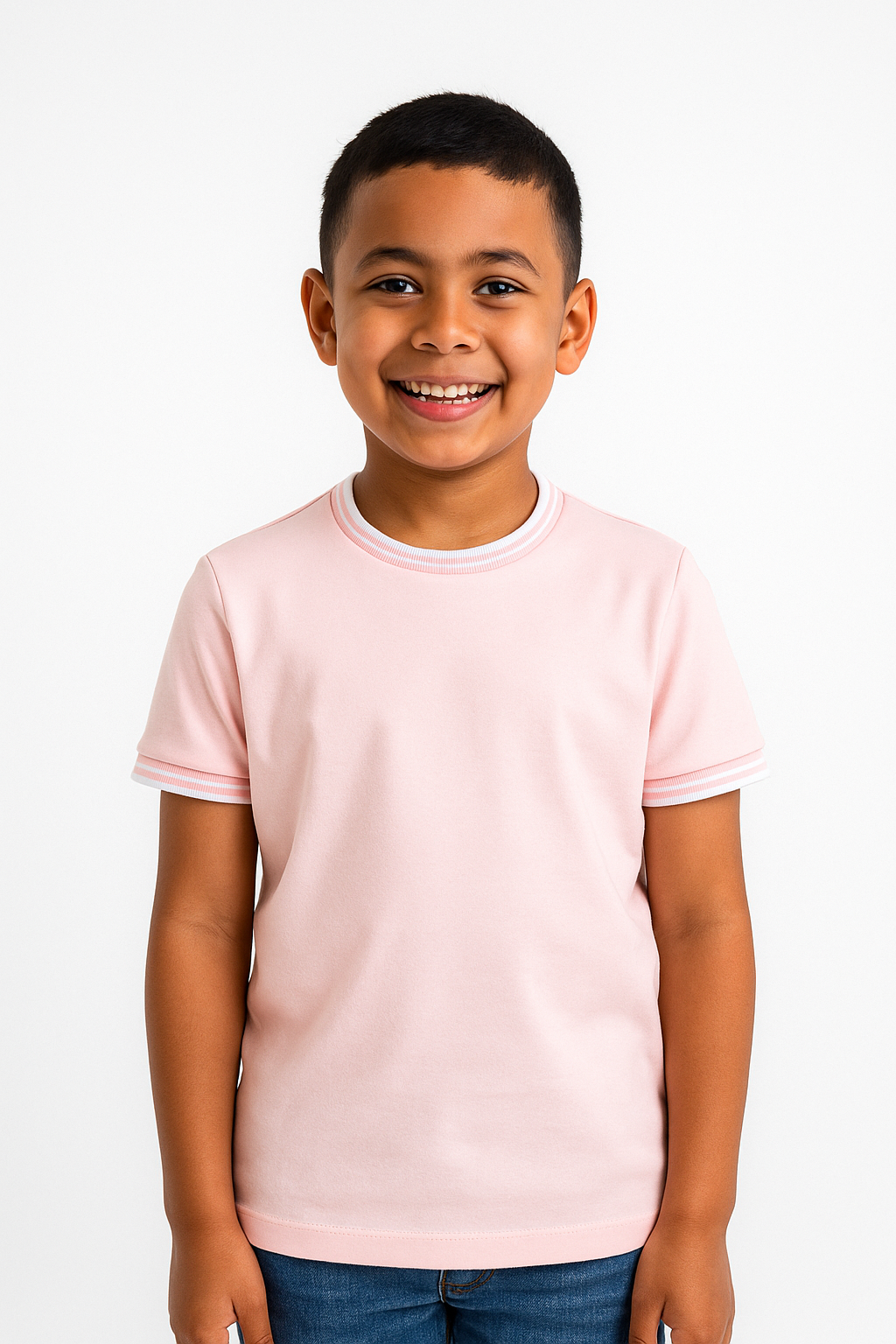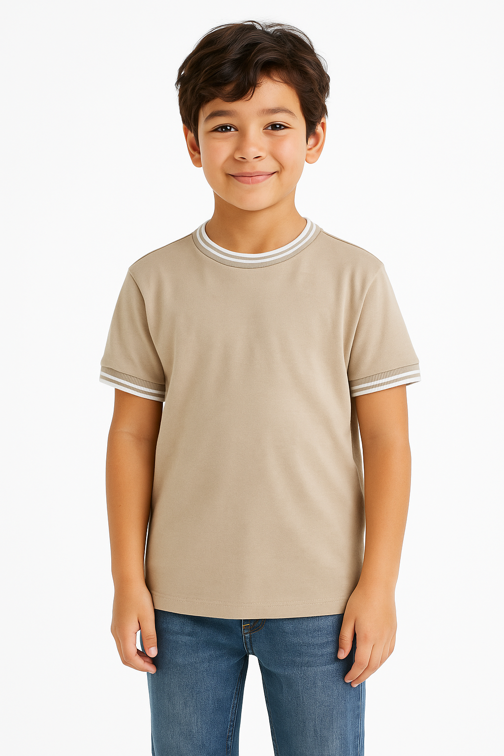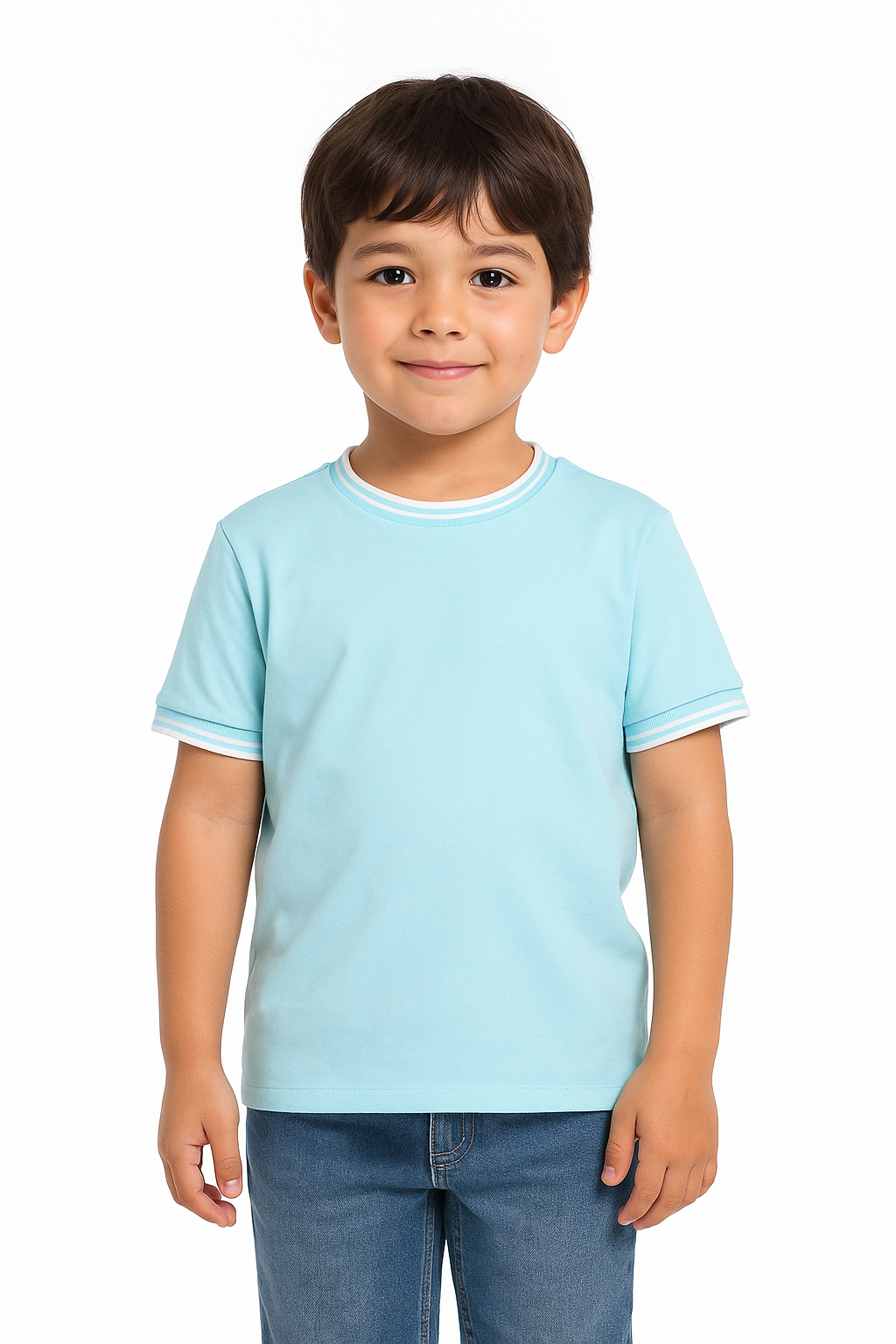 Simple, stylish, and comfortable — this kids’ crew neck t-shirt is crafted from a 60% cotton and 40% polyester blend that feels soft, breathable, and durable for everyday wear. Designed with contrast rib detail on the neckline and sleeves, it adds a sporty edge to your child’s casual wardrobe.