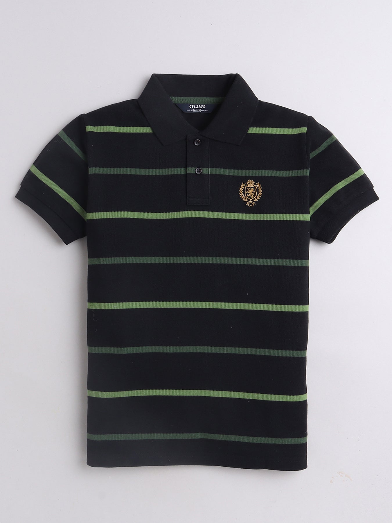 Give your kids a sporty and stylish look with the Celsius Boys Striped Polo T-Shirt, crafted from a soft and breathable cotton blend for all-day comfort. The classic polo collar, short sleeves, and bold stripe pattern make it a versatile piece perfect for school, play, or casual outings. Designed with an embroidered crest detail, this polo adds a premium touch while ensuring lasting durability.