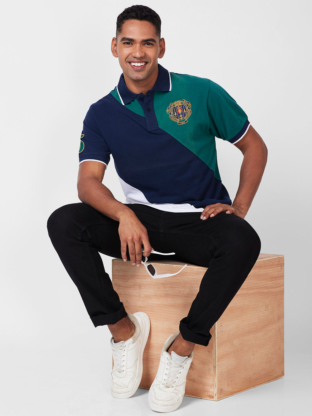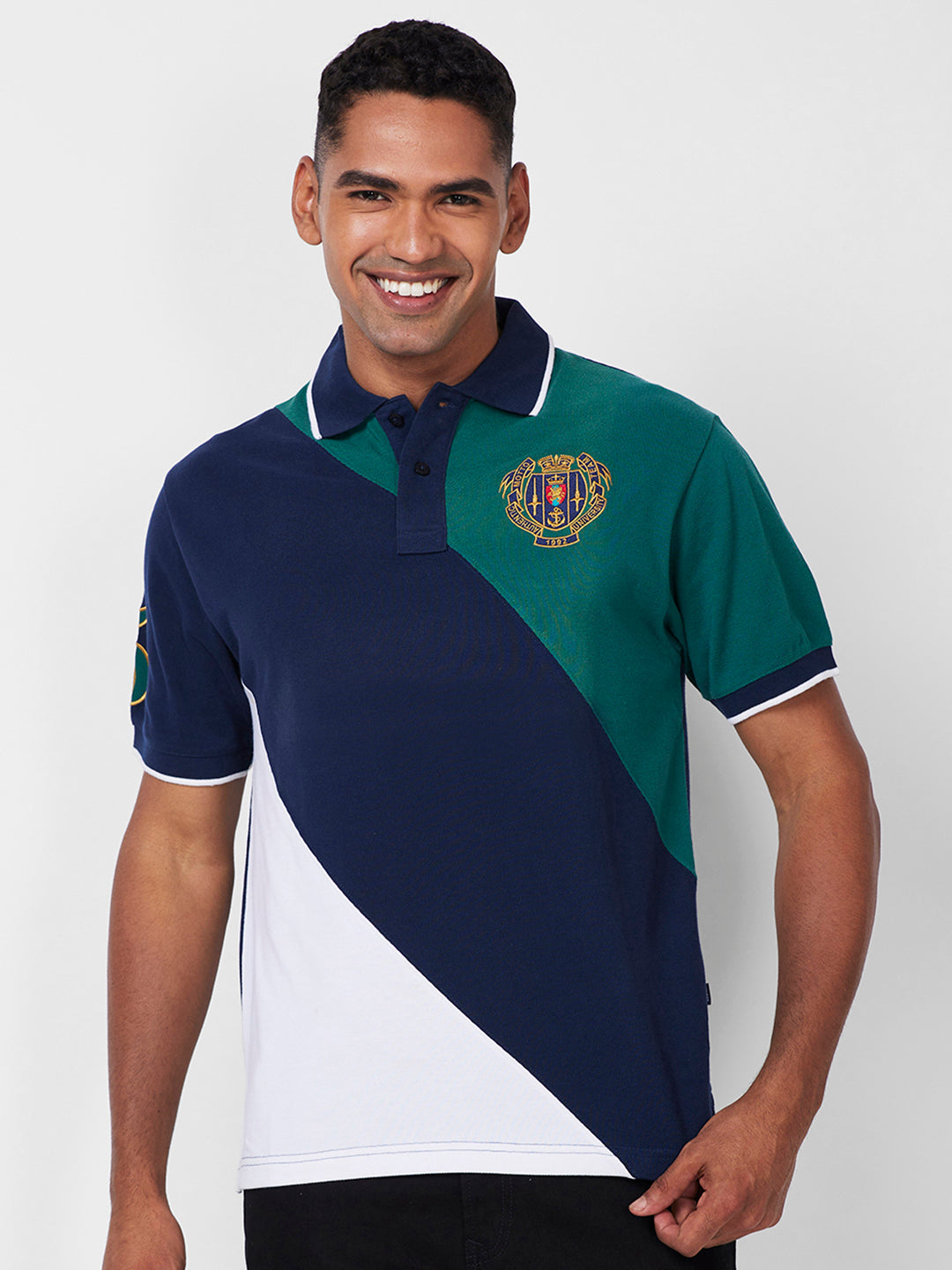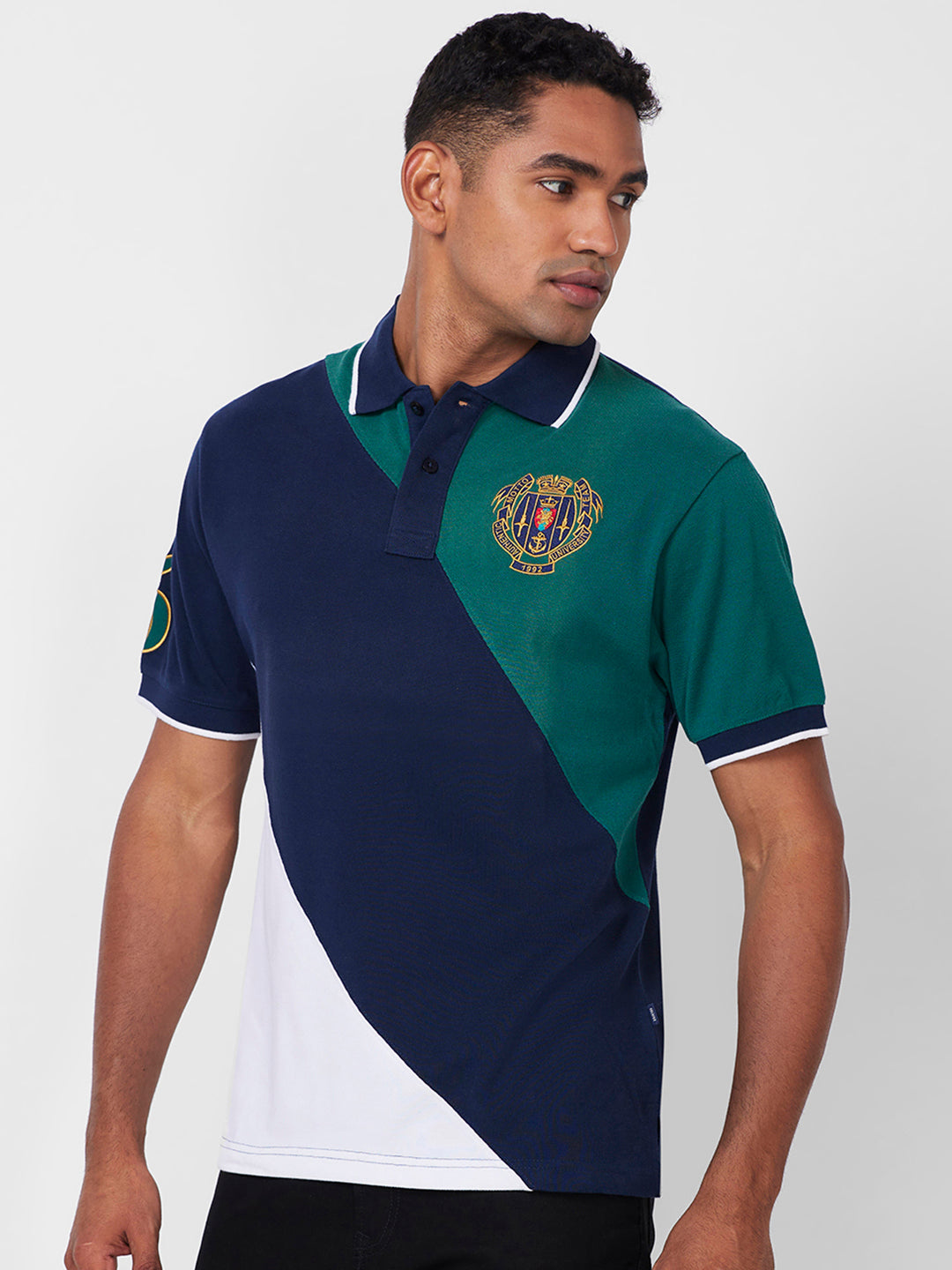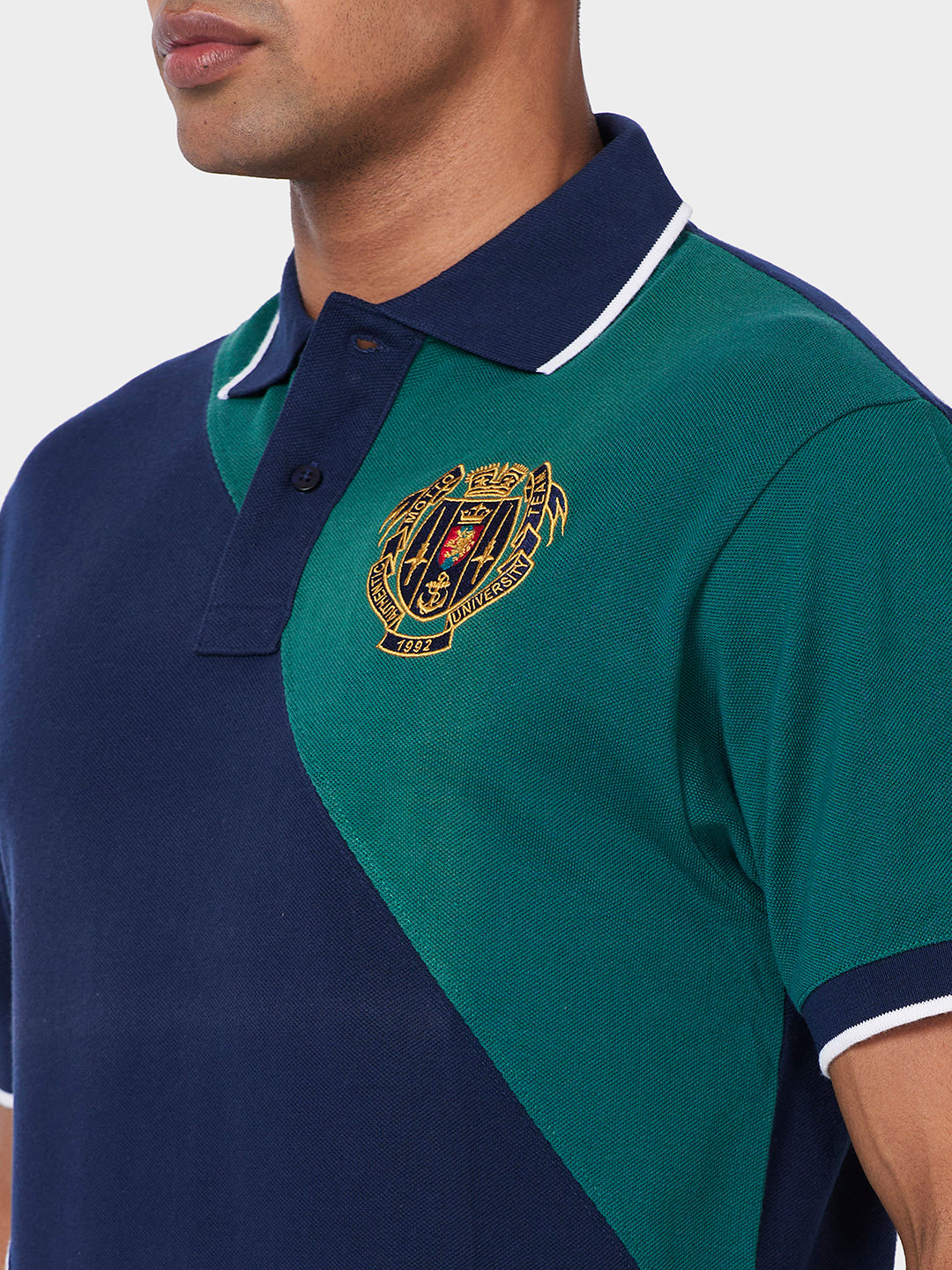 Make a bold style statement with this Colorblock Crest Polo T-Shirt from Celsius. Crafted from a premium 60% cotton and 40% polyester blend, this polo shirt is as comfortable as it is stylish. The unique diagonal panel design features a striking mix of dark jade, navy blue, and white, enhanced with a luxe embroidered crest on the chest and sleeve.