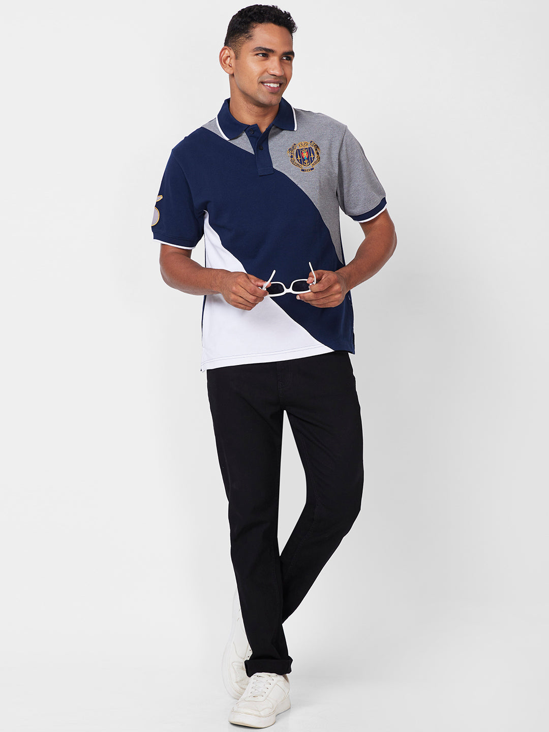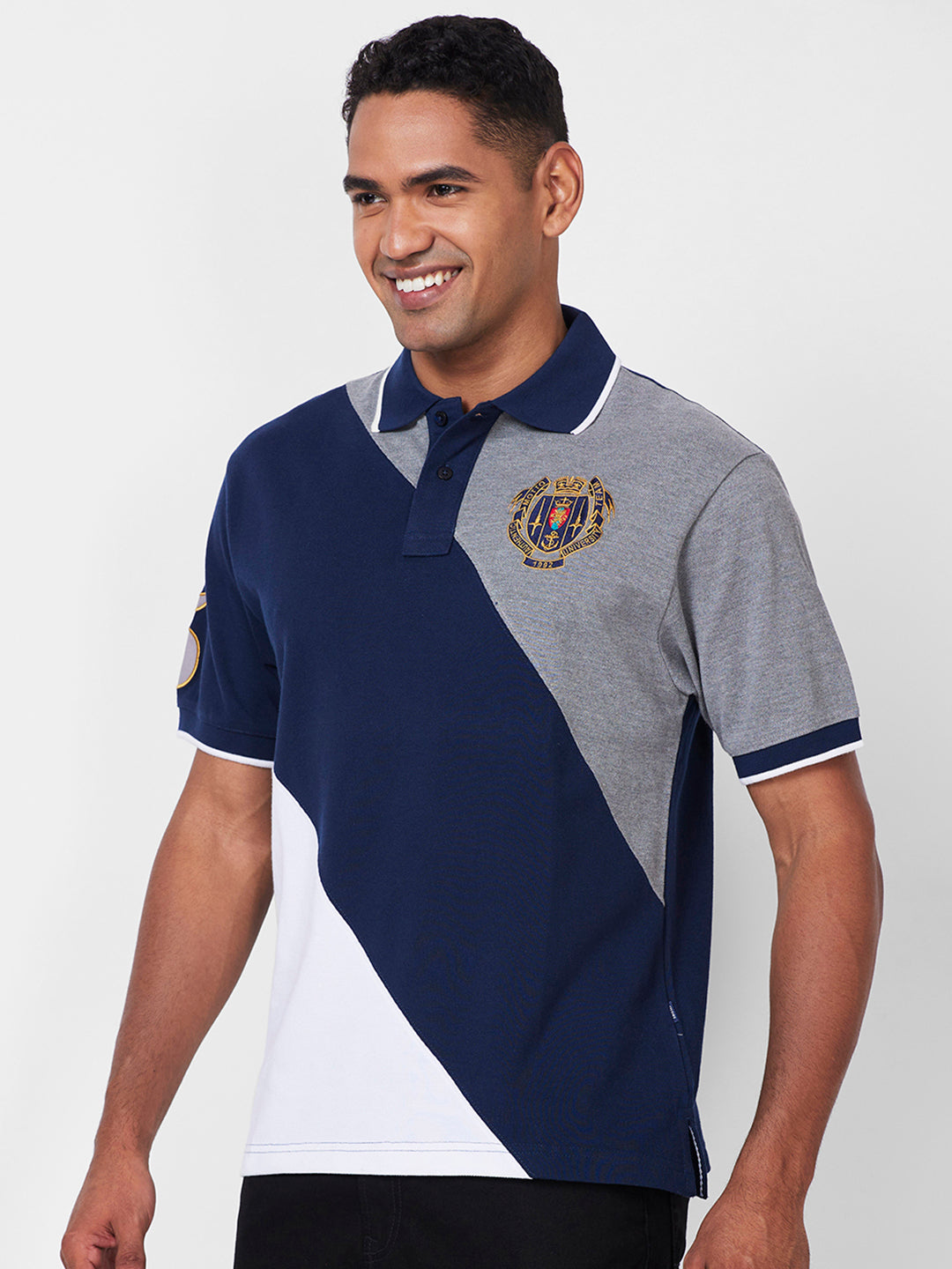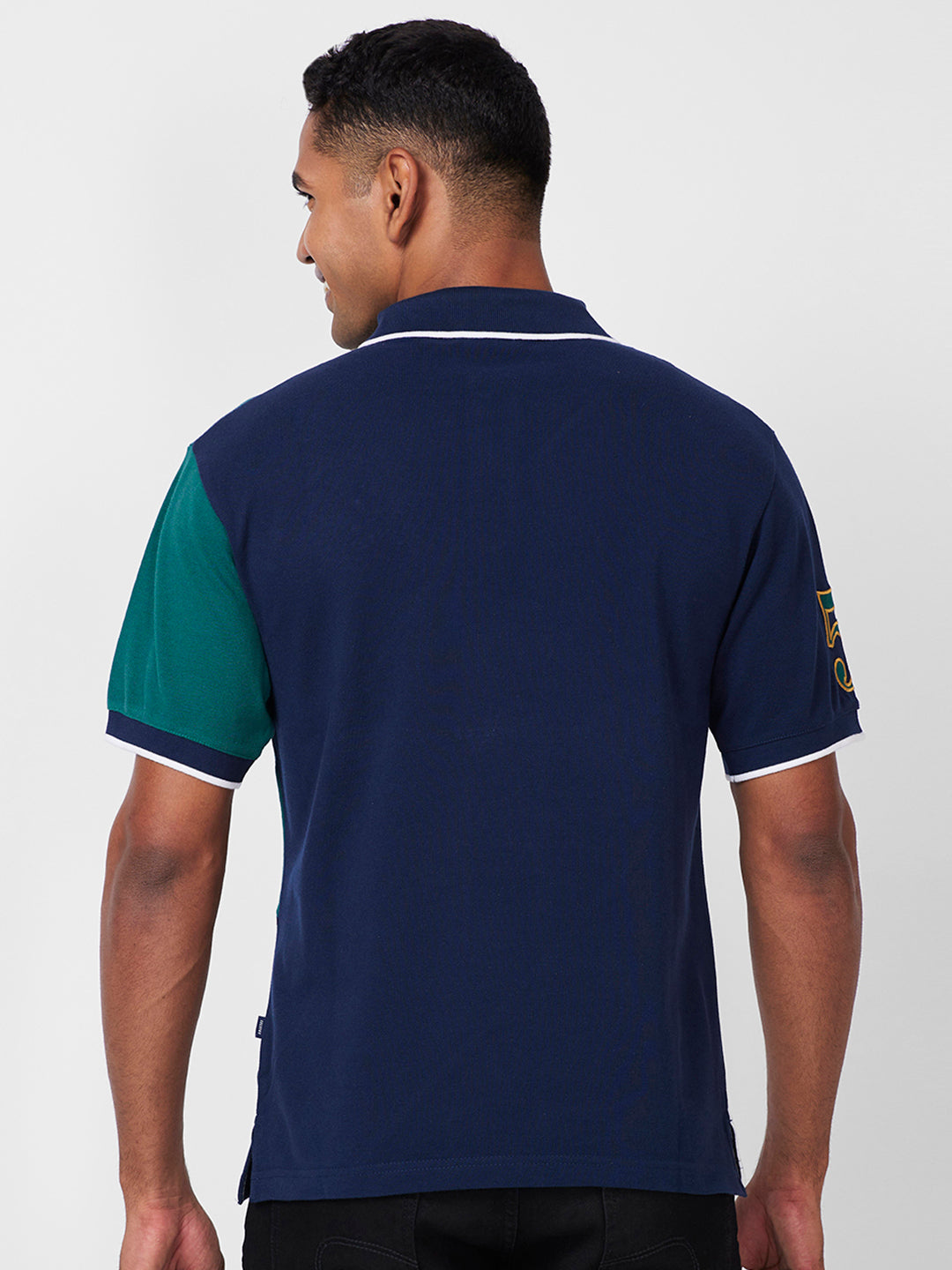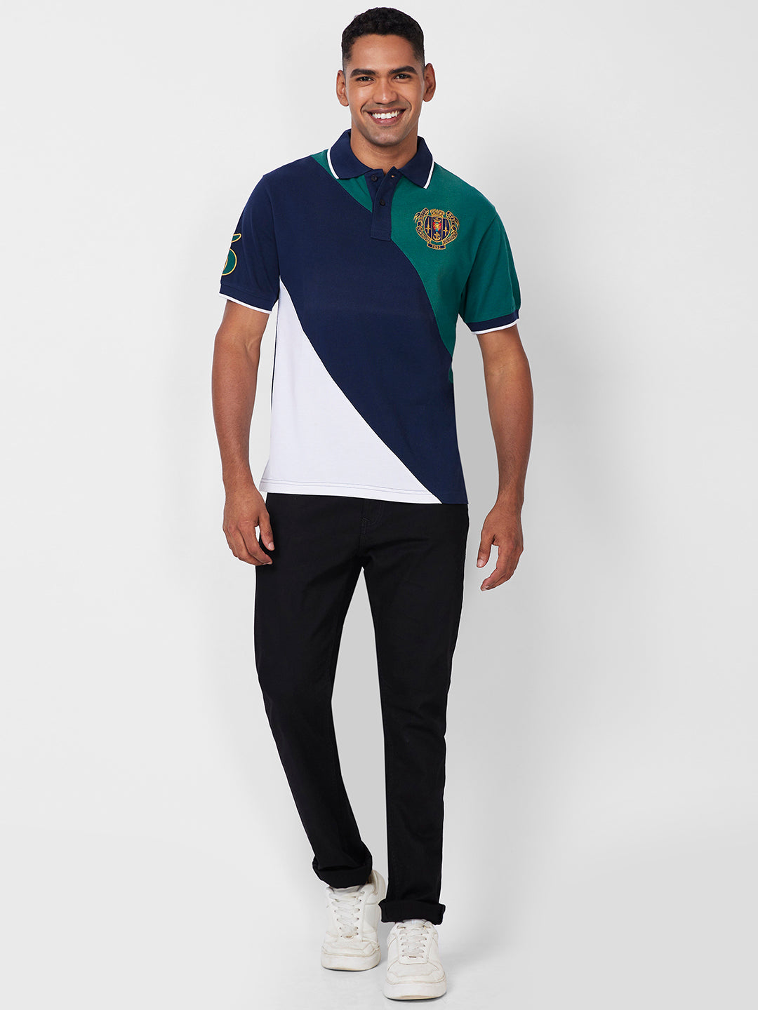 Make a bold style statement with this Colorblock Crest Polo T-Shirt from Celsius. Crafted from a premium 60% cotton and 40% polyester blend, this polo shirt is as comfortable as it is stylish. The unique diagonal panel design features a striking mix of dark jade, navy blue, and white, enhanced with a luxe embroidered crest on the chest and sleeve.