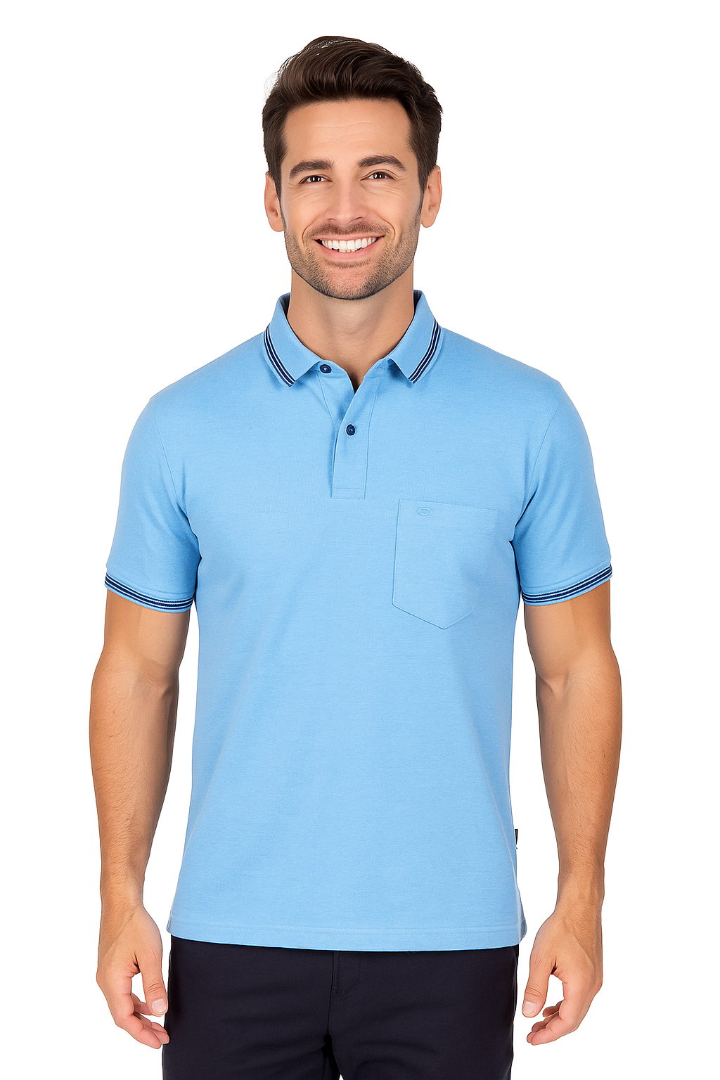 Make a clean, confident statement with this Big & Tall contrast tipped polo t-shirt in Awning Blue. Designed for larger builds, it offers a relaxed, breathable fit in a soft 60% cotton and 40% polyester blend. The contrast stripe detailing on the collar and cuffs adds a sharp touch, while the chest pocket brings in everyday utility. Ideal for work-casual, weekends, or going out in effortless style.