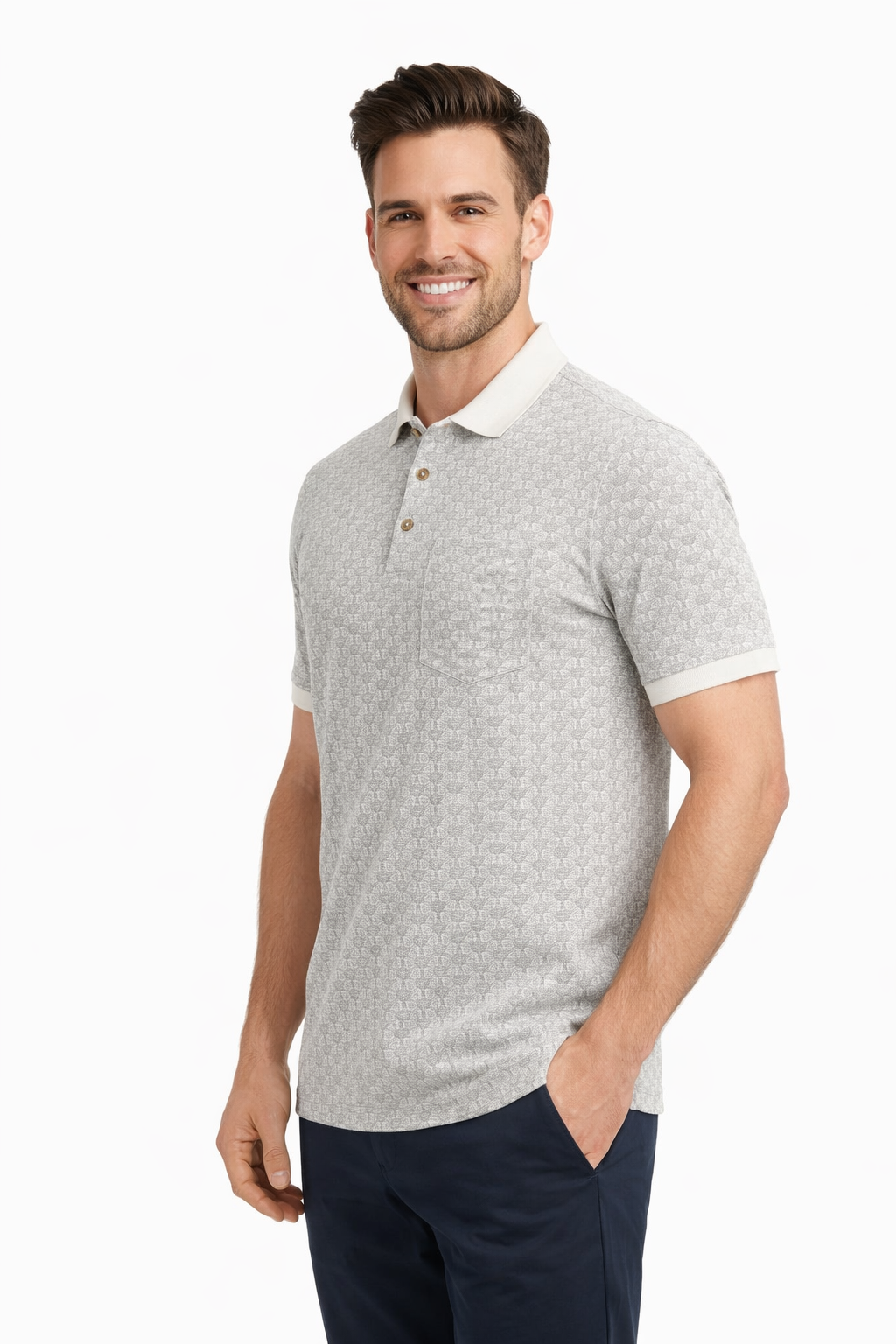 Elevate your everyday style with this Men’s Textured Printed Polo T-Shirt, designed for a sharp yet comfortable look. Made from soft, breathable premium cotton fabric, this polo features a refined all-over textured print that adds depth and character without being overpowering. The solid contrast collar with a classic button placket enhances its smart-casual appeal, making it ideal for office casuals, weekend outings, or evening wear. Easy to pair with jeans, chinos, or trousers, this polo delivers timeless style, comfort, and versatility in one essential wardrobe piece.
