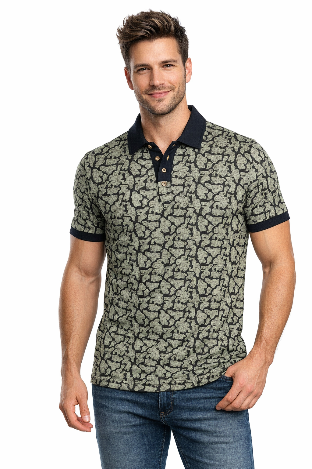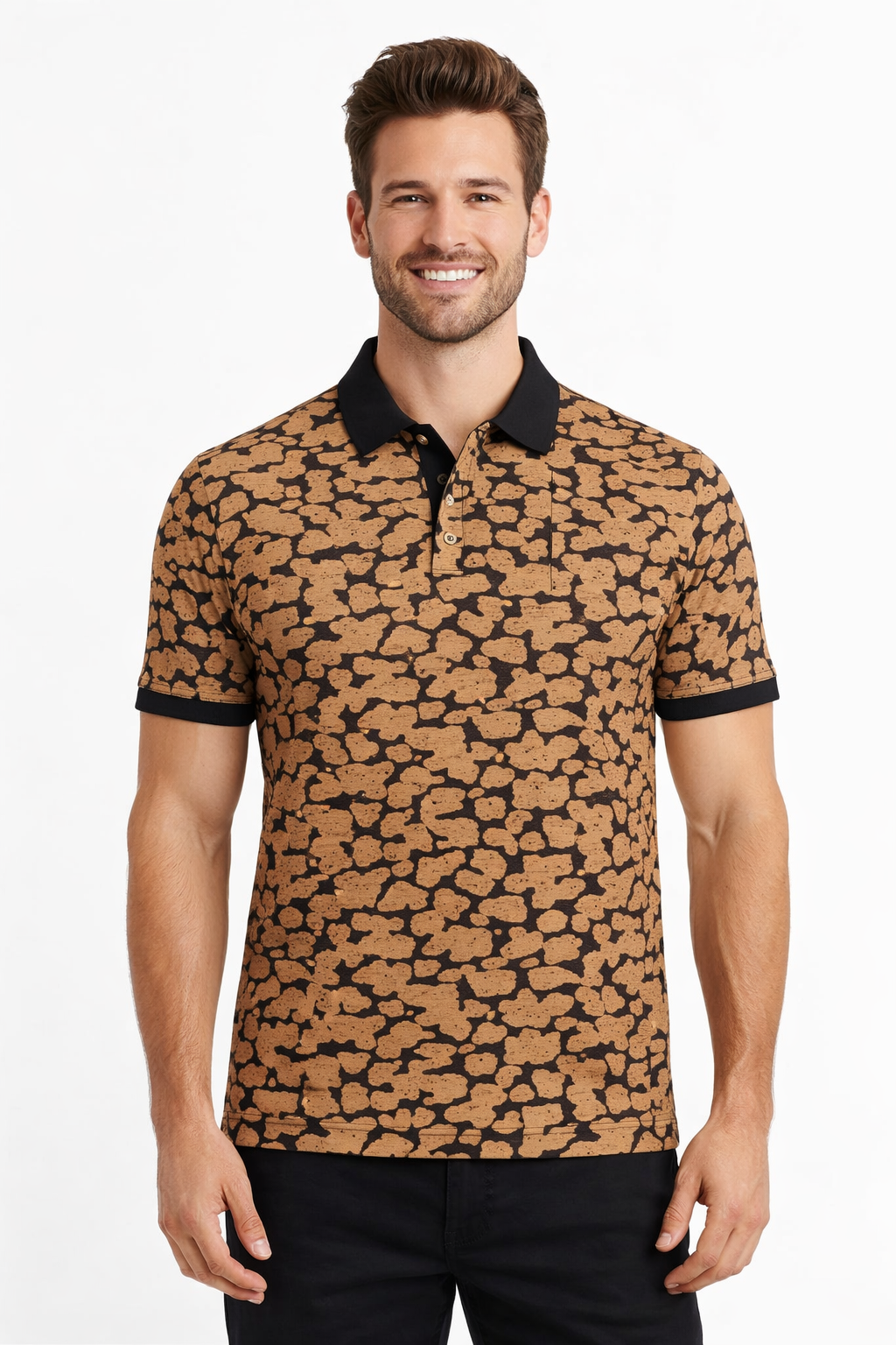Make a confident style statement with this Men’s Camouflage Printed Polo , crafted from a soft and breathable cotton-blend fabric for all-day comfort., while the all-over abstract print adds a bold, contemporary edge. Designed with a classic polo collar, contrast placket, and neatly finished sleeves, this polo strikes the perfect balance between smart and casual. Ideal for office-casual wear, weekend outings, or evening get-togethers, it pairs effortlessly with jeans or chinos for a polished, modern look.